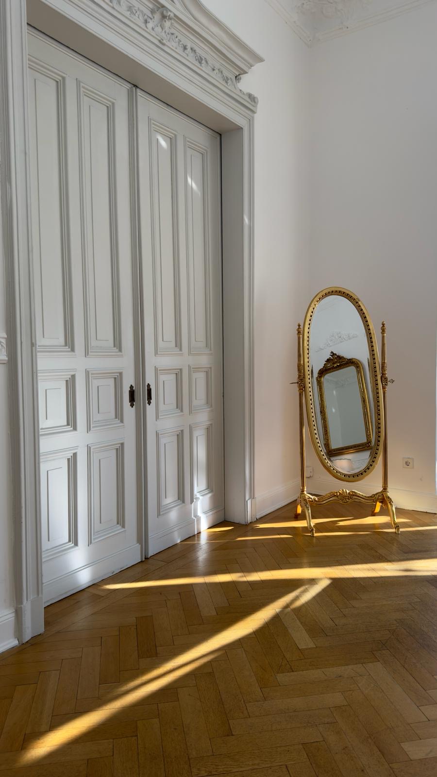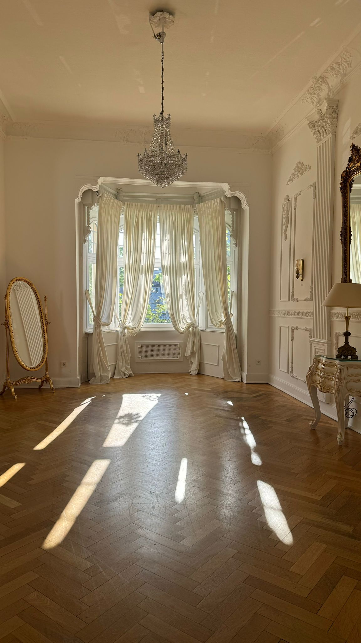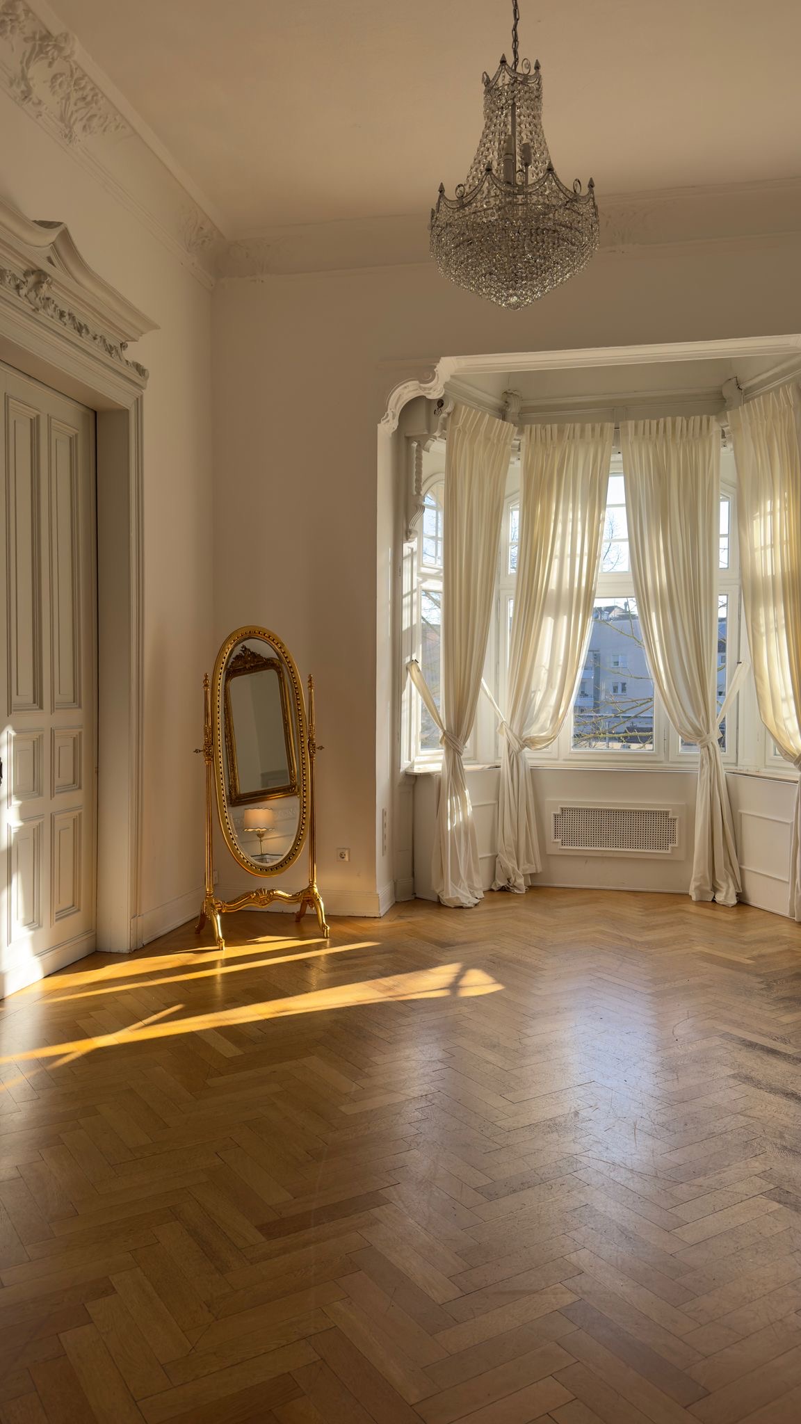 Die schlichte Eleganz des Raumes lässt viel Raum für kreativen Gestaltungsspielraum. Die weißen Wände, gepaart mit einem Laminatboden und minimalistischer Möblierung, erzeugen ein Gefühl von Ruhe und Zeitlosigkeit. Durch die großen Fenster strömt das natürliche Licht hinein und sorgt für eine perfekte Beleuchtung für Aufnahmen.